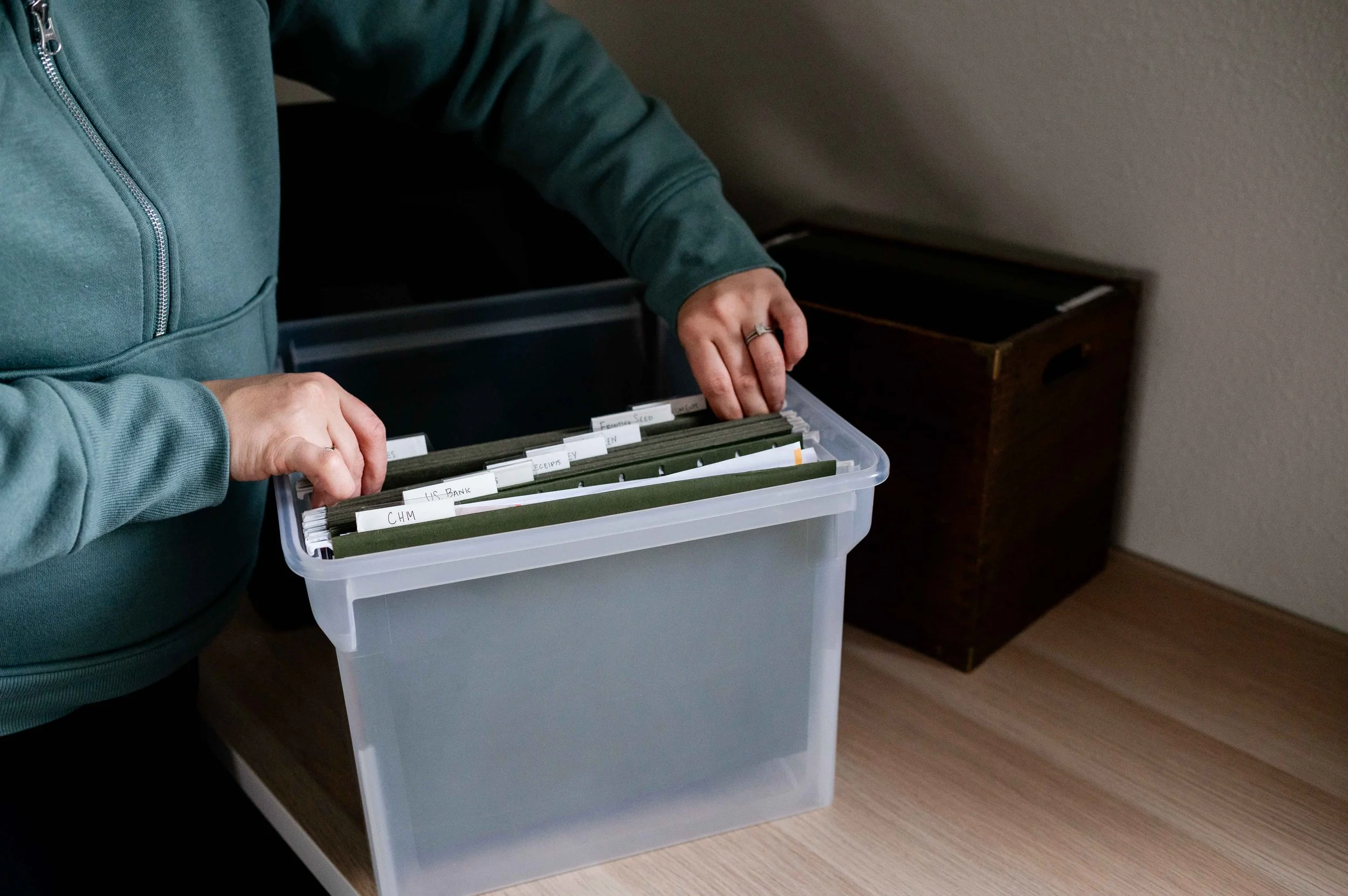 You will also need to get a plastic file bin to store the previous year’s files. At the end of the year, I’ll take all of the files and transfer them straight to this bin. I will use a sticky note to note the year if there are multiple years in the bin. It is good practice to keep old files because you will often need to reference them in the future & this way they’re easy to find. You can usually fit at least a few years in one bin.