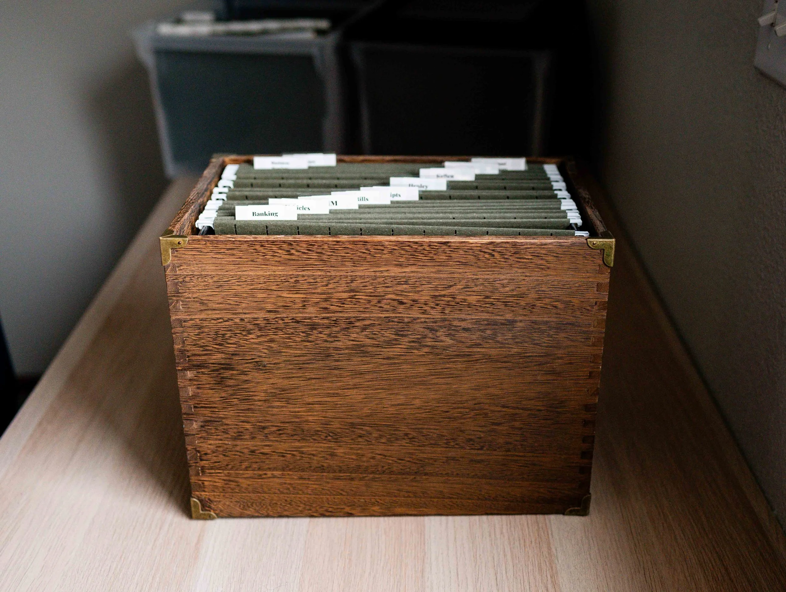 The first thing you’ll need is a filing box or cabinet of some sort. I love this wooden one because I can leave it out on my desk because it’s so cute, but also functional and easy to access whenever I need it.