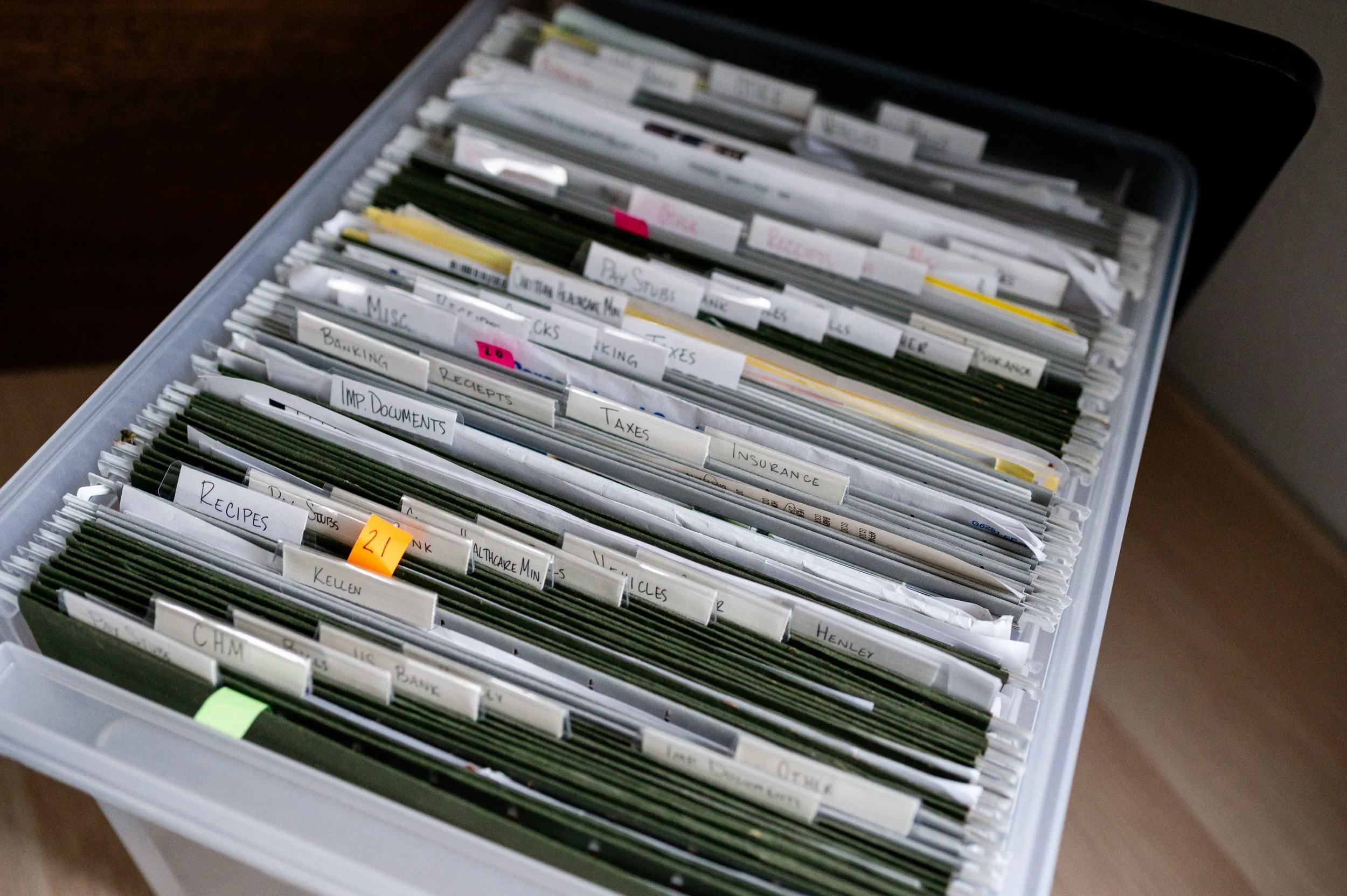 Then you just need any hanging files! You will also need to add the tabs with labels on them to keep things organized. You can use a label maker to make it all match, or just write them on. Every family will be slightly different, but these are the ones I am currently using: