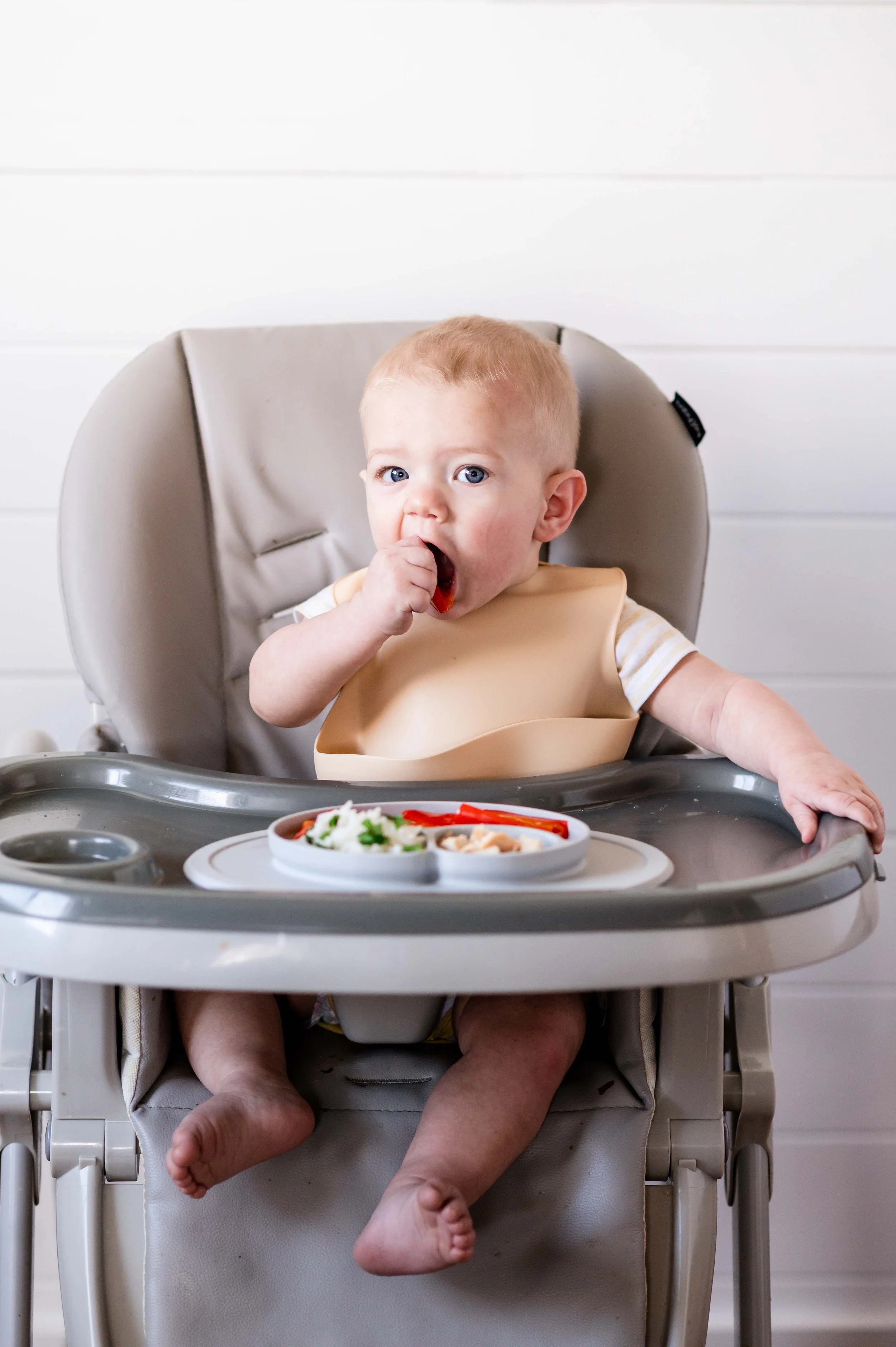 Suction plates. While you could put the food directly on the high chair tray, plates or bowls with a lip help baby grab the food easier. It also makes it easy to dish up a plate while you’re making a meal at the counter and then bring it to baby. These plates are my personal favorite. I have three at home, but you could totally get away with one and just wash it after each meal. They are dishwasher, microwave, and oven safe. They other day I accidentally set it on a hot burner while I dished Kellen’s lunch and it didn’t melt or leave a single mark! I love using them at restaurants too because it sticks to the table and then when we’re done, I just wipe it out with a wipe and stick it in a gallon ziplock bag to toss in the dishwasher when we get home.