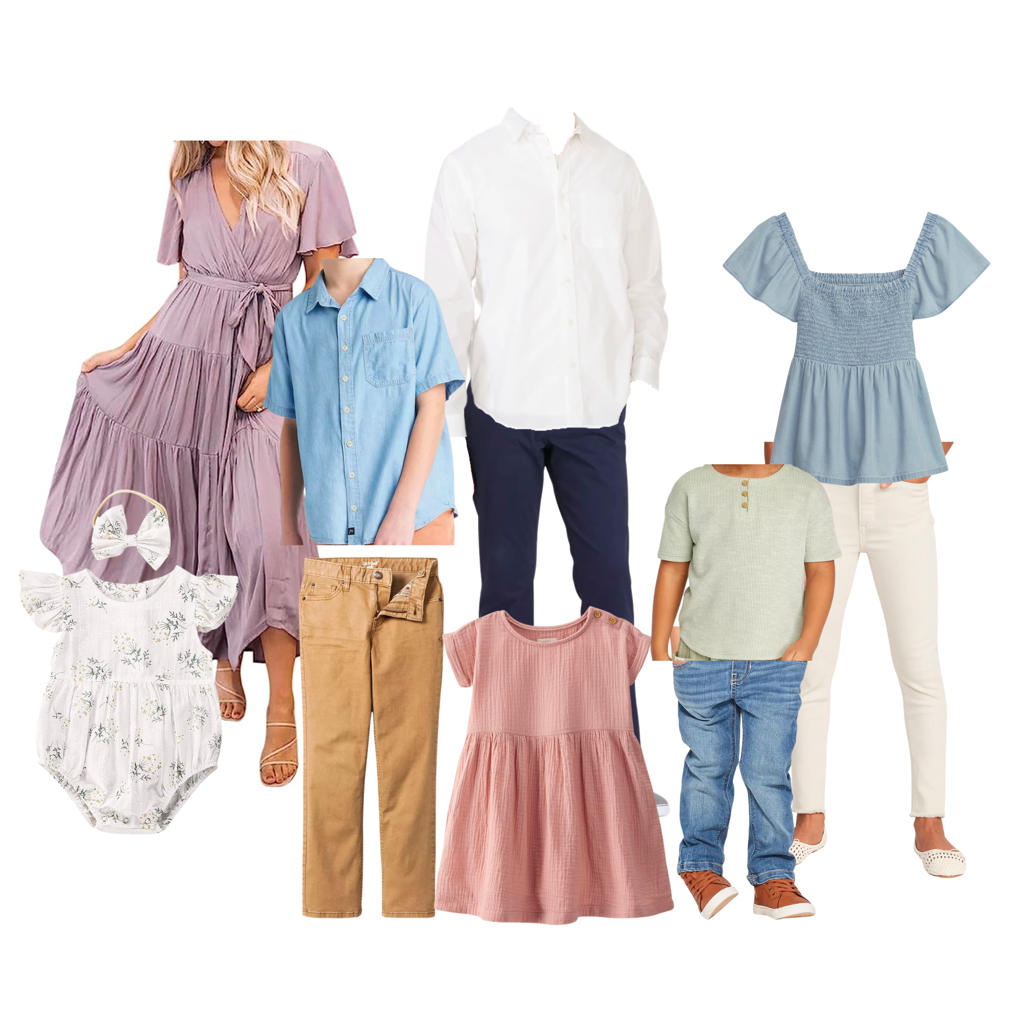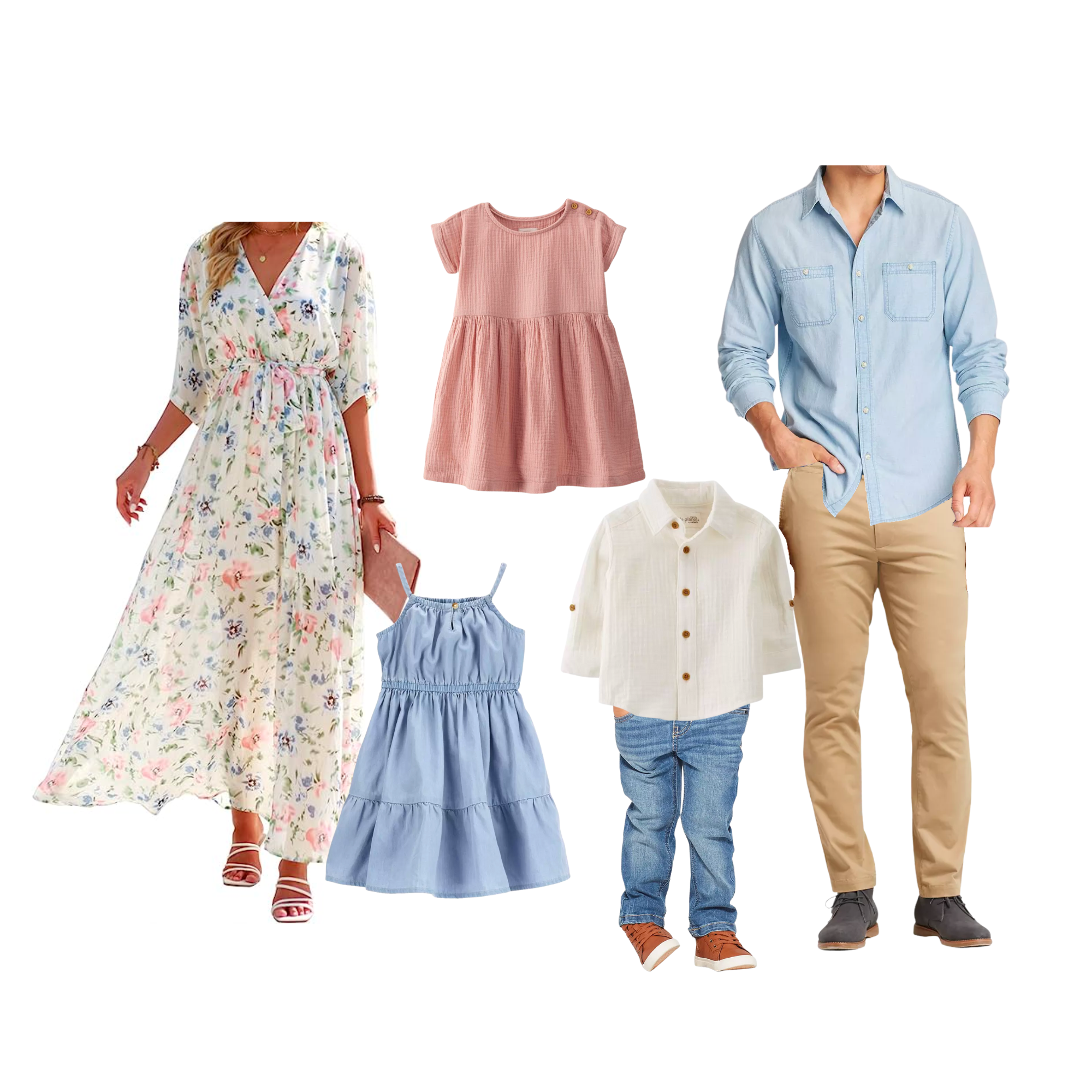 I made 5 different inspiration boards for you to get ideas from! Copy one totally or use it as inspiration for colors or types of clothing that you can adapt to your specific family! You’ll see how everything is complimentary to each other, yet nothing “matches”. You’ll also see how most of the items are solid. If there are any patterns, they are minimal and compliment the other pattern in the family.